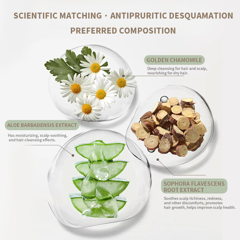 Plants: such as field mint leaves, golden chamomile, bitter ginseng, aloe vera Curaçao, fragrant leaf geranium, etc. These plant essential oils are rich in a variety of active ingredients, with soothing and nourishing scalp effect.