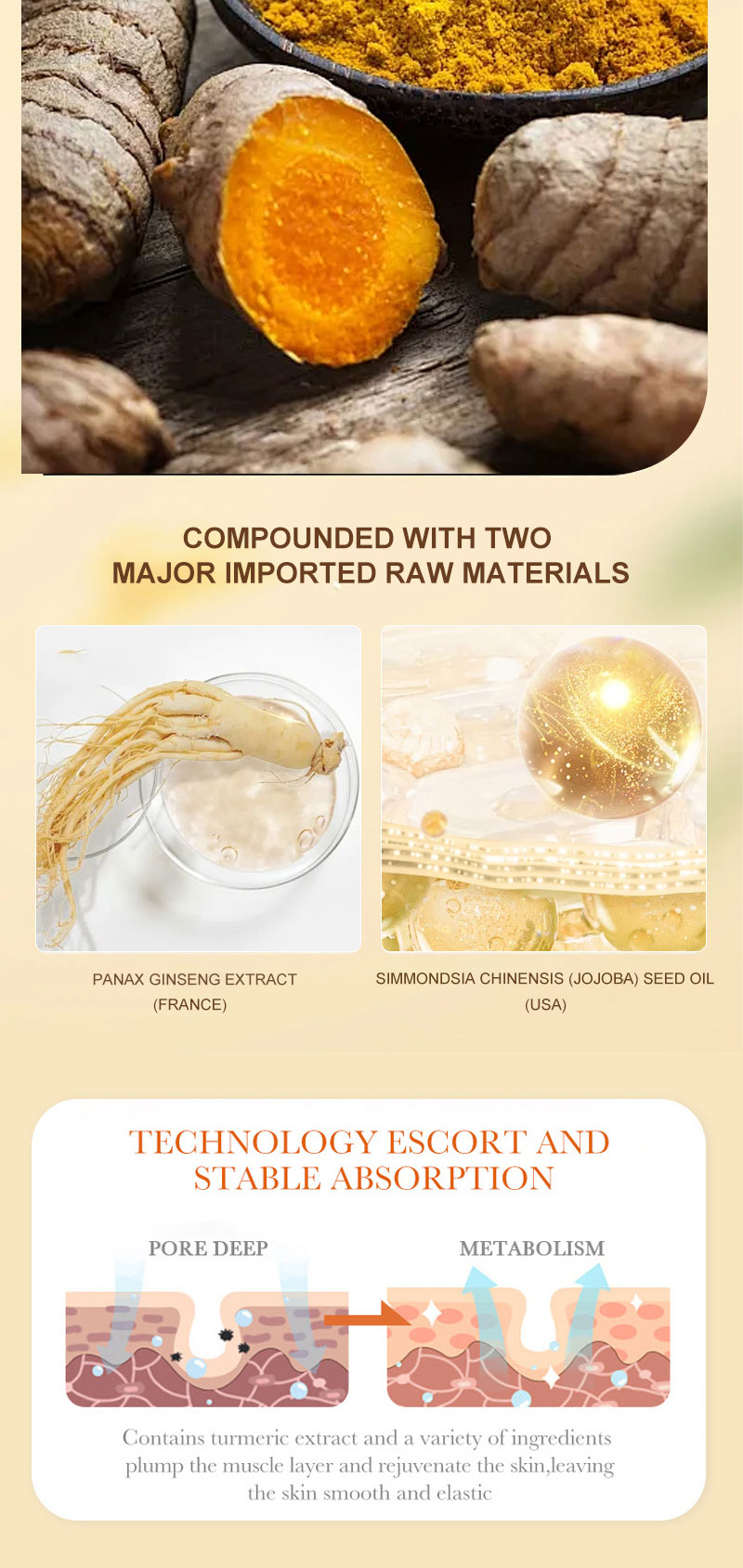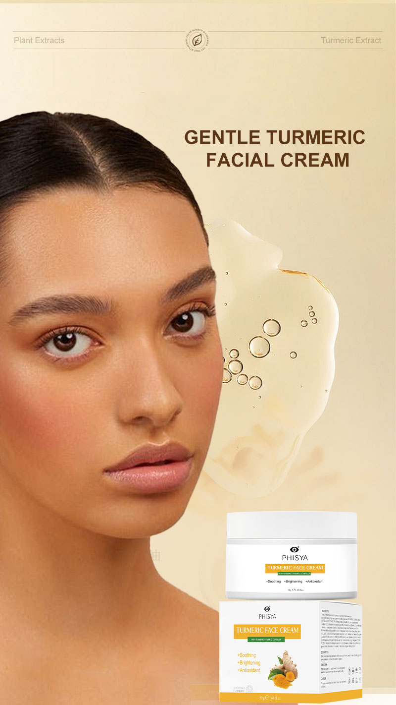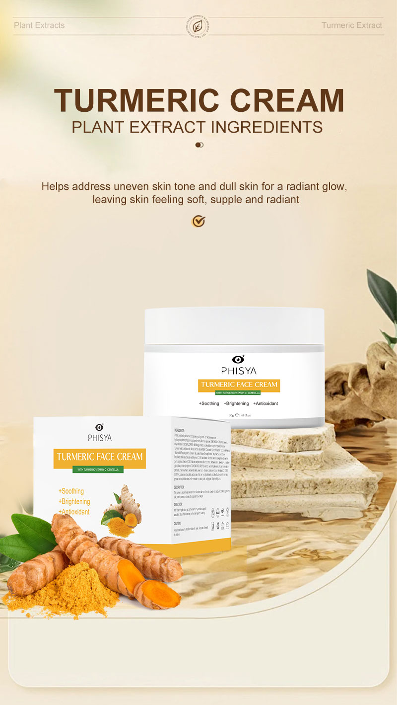 Product Name: Turmeric Facial Cream Feature:Anti-aging, Whitening, Skin Revitalizer, Anti-wrinkle Ingredient:Sulfate-Free, Vitamin C, Fragrance-free, Silicone-Free, Paraben-Free, Hyaluronic acid, Cruelty-Free, Oil-free